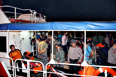 Sekitar pukul 17.00 wib KN SAR 224 SAR JKT bersama Pos SAR Merak, PolAir Polda Banten, dan Lanal Banten langsung menuju koordinat yang dimaksud untuk melakukan evakuasi. KN SAR 224 SAR JKT berhasil melakukan evakuasi terhadap penumpang kapal imigran tanpa nama tersebut dan mengevakuasi 81 orang termasuk ABK Kapalnya, hingga 2 Agustus 2013 pukul 00.15 wib KN SAR 224 JKT merapat di dermaga Indah Kiat Pelabuhan Merak Banten untuk menyerahkan imigran gelap yang berasal dari Pakistan dan Iran tersebut kepada pihak yg berwajib. Seluruh penumpang dinyatakan selamat, hanya satu yang mengalami trauma kaki karena terhimpit oleh kapal ketika sedang proses evakuasi dikarenakan cuaca buruk di Barat Pulau Panaitan. (dv/hmsjkt)