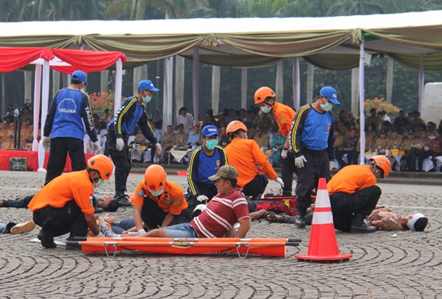 Jakarta - Manajemen penanggulangan terhadap bencana harus terus dilatih guna meningkatkan kinerja terhadap unsur-unsur yang telah ada untuk meminimalisir terjadinya korban jiwa, inilah yang dilakukan pada Hari Kesehatan Nasional pada tanggal 12 November 2013 di Lapangan Monas, Jakarta Pusat. Simulasi penanganan bencana ini sebagai puncak acara dari Hari Kesehatan Nasional 2013 dengan melibatkan dari berbagai macam-macam unsur yang dimiliki pemerintah ataupun swasta, antara lain Badan SAR Nasional, Kementerian Kesehatan, TNI, POLRI, Pemadam Kebakaran dan Penanggulangan Bencana, Kementerian Sosial, Ambulance 118, dan PMI. Semua unsur menjalankan tugas, pokok, dan fungsinya masing-masing dalam simulasi tersebut. Simulasi yang berdurasi kurang lebih 30 menit ini mengambil kejadian bencana alam dan kebakaran yang terjadi di wilayah Indonesia. Selain simulasi tersebut, acara dimulai dengan Upacara Hari Kesehatan Nasional yang dipimpin sendiri oleh Menteri Kesehatan RI, Nafsiah Mboi, SpA, MPH. (hms/rml).